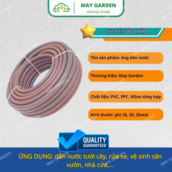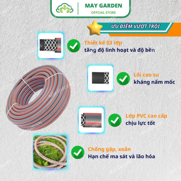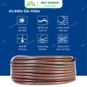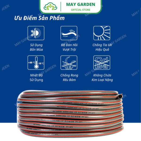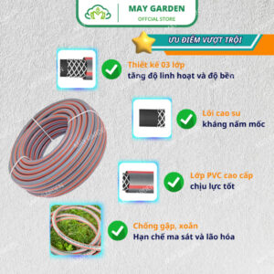Ống dẫn nước sân vườn MAYGARDEN là loại ống cao cấp với khả năng chống gập xoắn, hạn chế ma sát, chống rong rêu bám lòng ống. Sản phẩm có độ bền vượt trội so với các loại ống thông thường khác (thời gian sử dụng có thể đạt đến 9 năm). Ống sân vườn 3 lớp MAYGARDEN có thể sử dụng quanh năm, chịu được thời tiết lạnh giá và nắng nóng (-5°C đến +65°C).